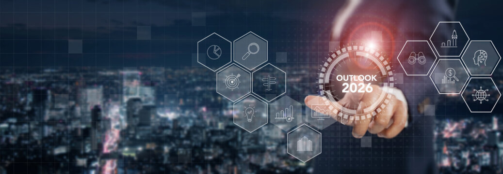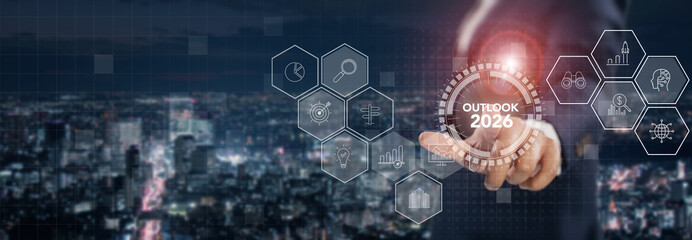 Outlook 2026, future business  and strategy concept. Glowing  Outlook 2026 digital interface over a cityscape, symbolizing future strategy, analytics, innovation and data driven planning.
