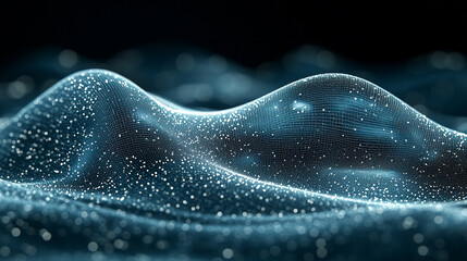 Glowing digital data points forming a rising and falling wave graph on a dark background representing data visualization and analysis