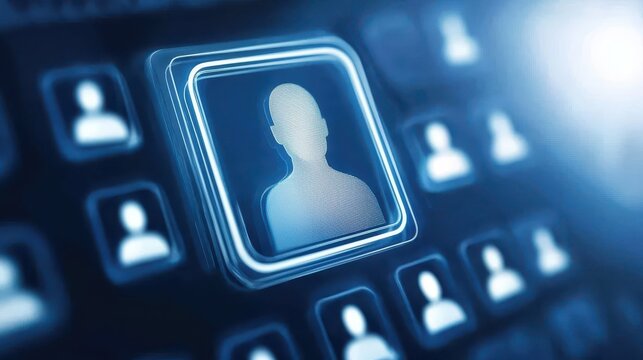 Face in blue button, digital identity and online connection in the technological age