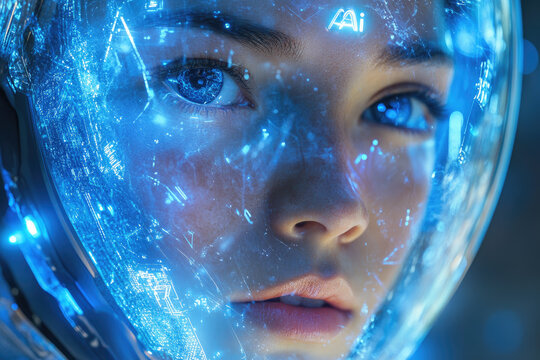close-up of a woman s face being processed by ai digital facial recognition overlay and data analysis futuristic screen and glowing interface in the background soft blue lig