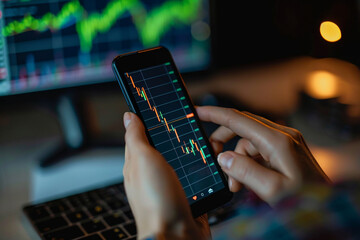 Person holding smartphone displaying financial chart with stock market data, trading app interface in low light.