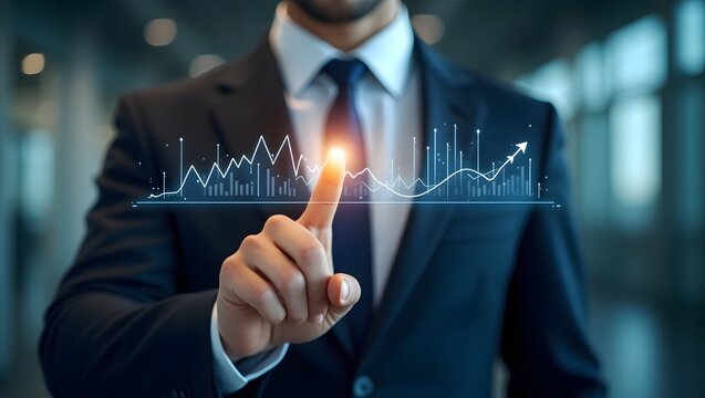 Businessman analyzing financial growth graph for 2025 and 2026 with a futuristic digital interface