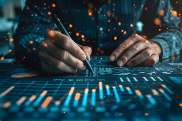 Businessman is pointing on a hi technology futuristic digital screen with financial analytics