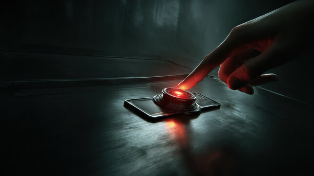 A close-up, abstract digital illustration featuring a glowing red fingerprint scan on a dark, textured surface. Multiple blurred red circular elements are visib