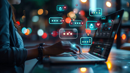 Woman Engaging with Social Media on Laptop. A woman interacts with floating social media icons and chat bubbles over her laptop in a vibrant urban setting at night.