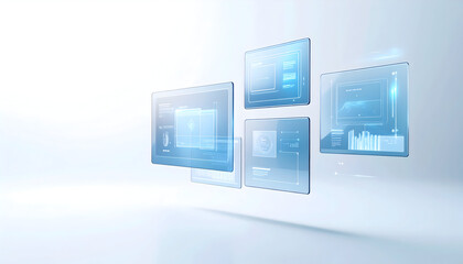 Futuristic holographic interface with floating transparent screens displaying data in a minimalist, blue-toned, high-tech digital environment