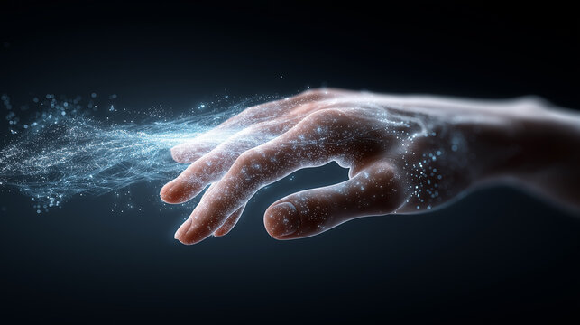 Human hand touching a glowing surface with floating digital particles symbolizing technology interaction.