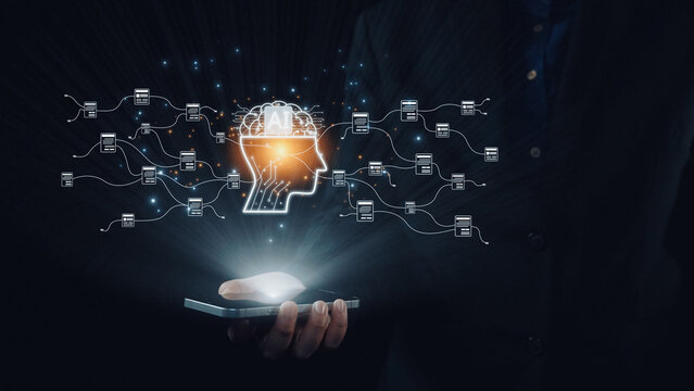 Digital AI brain interface representing human–machine interaction and cognitive computing.