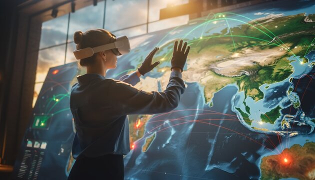 Woman Wearing VR Headset Interacting with a Large Digital World Map Display Showing Global Network Connections and Data Flow in a Futuristic Control Room