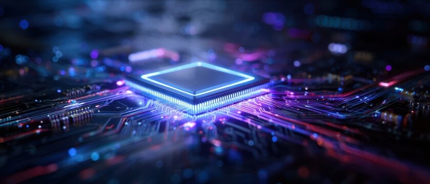 The microchip surrounded by glowing circuit patterns in a futuristic setting.