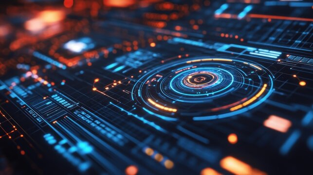 Digital Interface Abstract: A captivating abstract image depicting a futuristic digital interface, with glowing circles of orange and blue light, symbolizing technological advancement and data flow.