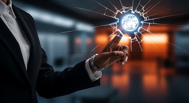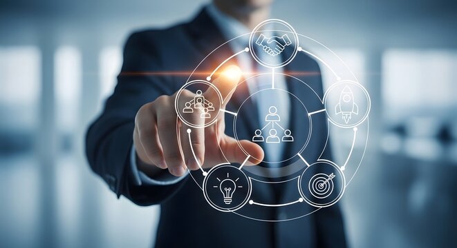 Professional businessman interacts with futuristic digital dashboard for data analysis and business strategy planning