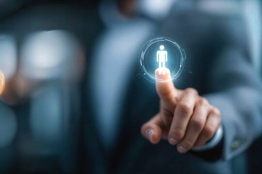 Hand of executive touching glowing user icon on dark background demonstrating professional selection, concept for personnel management, recruitment strategy and digital connection system