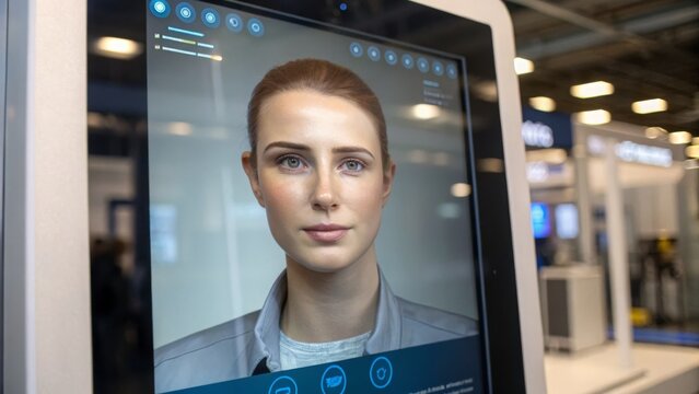Futuristic Identity Concepts in Manufacturing Aesthetics. A lifelike digital human avatar is displayed on a large screen at a technology exhibition.