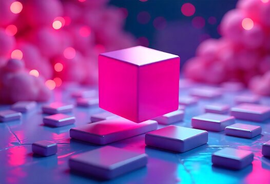 Abstract neon glowing geometric shapes with square, circles, and digital pixelated cube structures in vibrant pink and blue light on a textured concrete background.