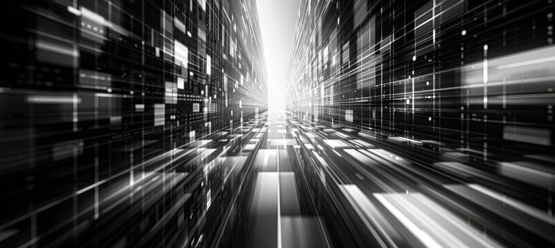 A futuristic digital landscape of glowing data blocks and geometric shapes, depicting advanced technology and connectivity in a cyber environment.