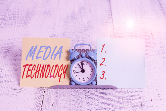 Text sign showing Media Technology. Business photo text process of huanalysis origin that used to convey media Mini size alarm clock beside a Paper sheet placed tilted on pastel backdrop