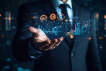 Businessman interacting with digital financial data and analytics interface for investment growth