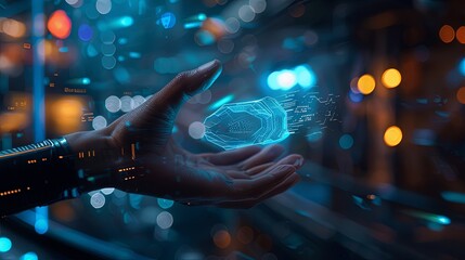 A futuristic cityscape at night. with holographic.