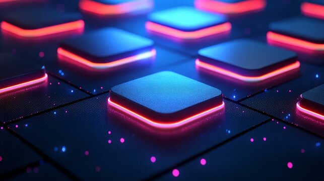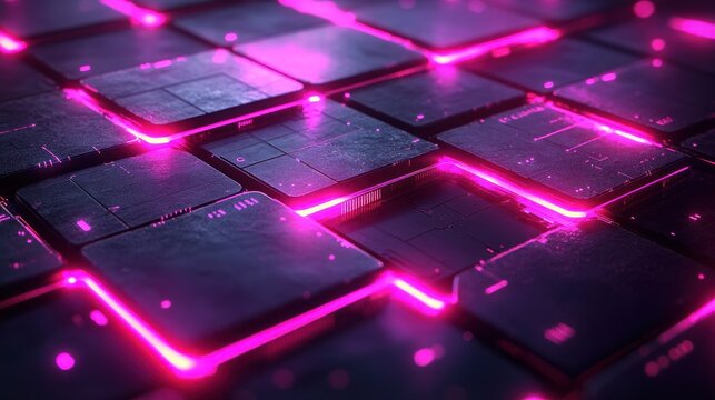 Three dimensional array of glowing purple and gray squares creates a modern digital background