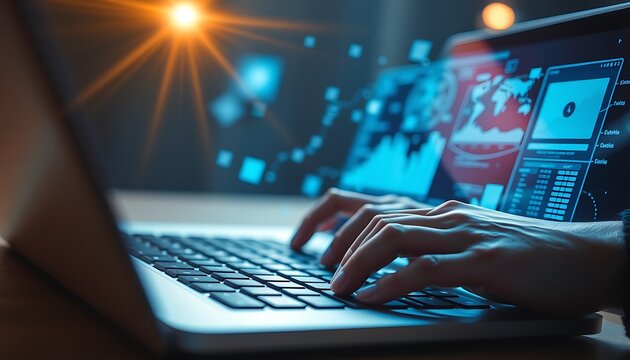 Futuristic digital interface displaying data visualizations, charts, and global information on a screen.