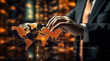Hand pointing at a digital screen with global maps and graphs for smart business planning