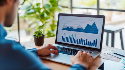 Financial planner analyzing a line graph on a laptop clear visualization of investment growth over time modern digital interface