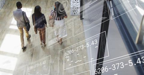 Walking business colleagues across modern atrium with holographic data overlays and glass rail