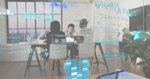 Coworkers discussing analytics with holographic data overlay in bright office meeting