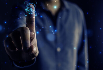 a man touching a finger on a virtual scanner, personal data , thumbprint, holographic interface, data holograms