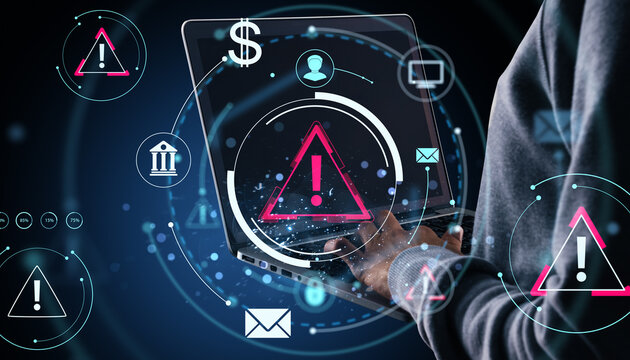 Cybersecurity warning symbols over person using laptop in digital interface, highlighting online financial fraud alert concept on dark background.