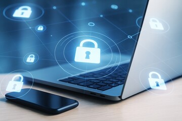 Cybersecurity concept with padlock icons over laptop and smartphone on desk, symbolizing data protection and digital privacy technology. Ai generative