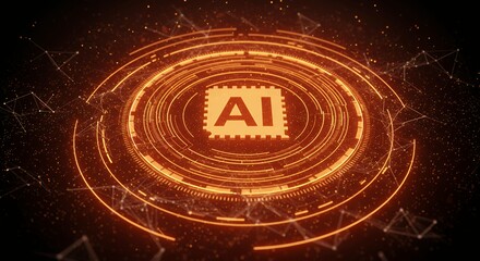 Futuristic AI artificial intelligence holographic interface with glowing orange circuits and digital network connections technology concept