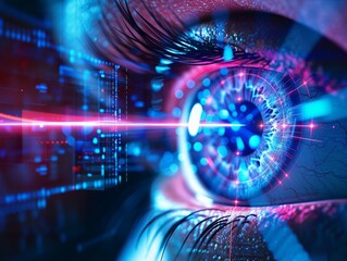The human eye with embedded digital technology close-up.
