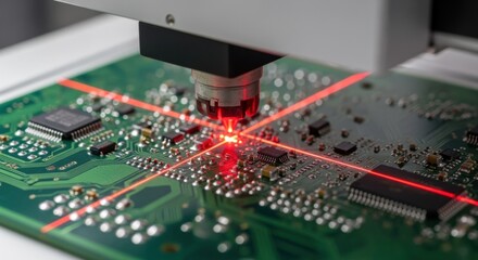 Precision Laser in Electronics: A focused laser beam meticulously scans a circuit board, highlighting the intricate technology and the advancement in electronics.