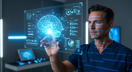 A man interacts with a glowing holographic display showing detailed brain scans and intricate scientific data in a modern, dimly lit laboratory setting.