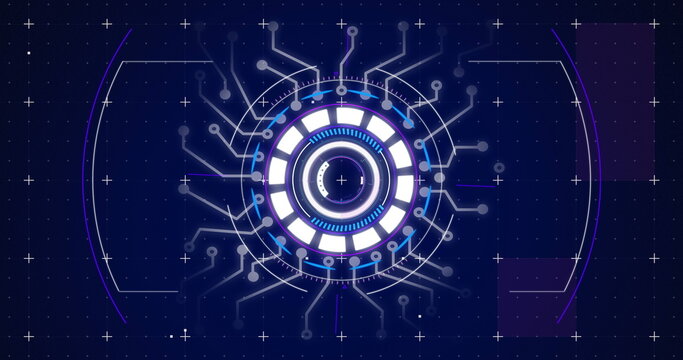 Data processing scope scanning over a woman's eye, illustrating global networking, technology, and digital interface concepts in a futuristic, digitally generated image.