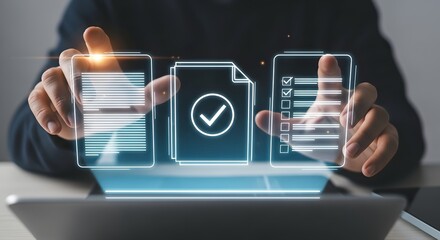 Digital file folders emerging from laptop screen, symbolizing efficient data organization, streamlined file management, and modern digital workflow solutions in a high-tech computing enviro 91178922 2