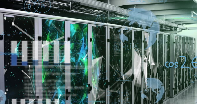 Futuristic tech interface with mathematical overlay in server room
