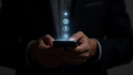 Close up of a person holding a smartphone with a stream of glowing digital icons and data flowing upwards from the screen into the darkness representing technology and connectivity