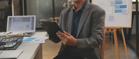 Top view of developer team designing Ux Ui design for phone interface or planning for making digital development. Startup project send develop plan to manager while sitting at boardroom. Convocation.