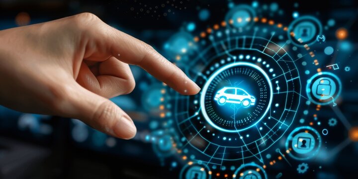 A hand presses a holographic car symbol to start an electric car, Generative AI