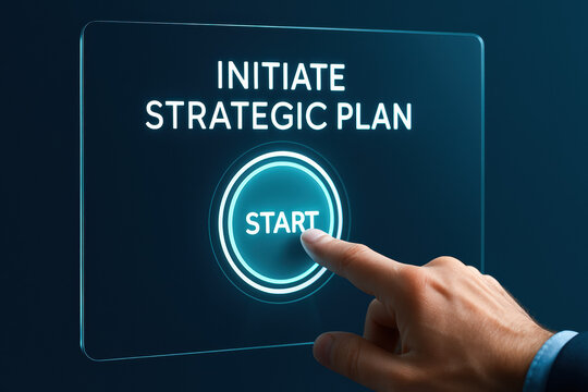 A hand pressing a start button on a sleek digital interface symbolizes decision making and business strategy driving innovation and growth
