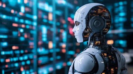 Advanced humanoid robot analyzing data in a futuristic server room, symbolizing AI and technology progress in a vibrant digital environment.