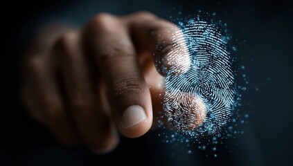 Close-up of a hand touching a digital fingerprint overlay