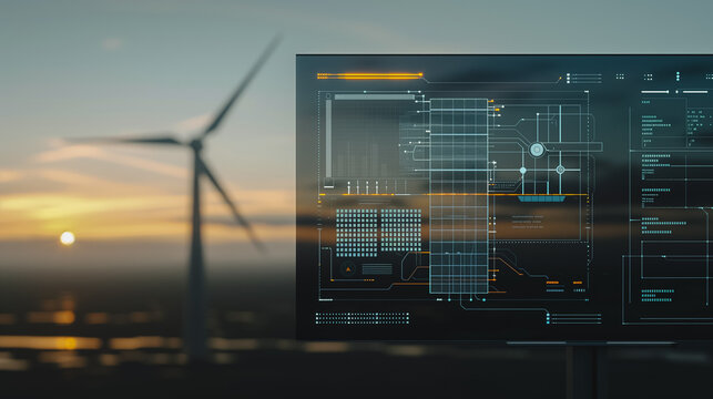 Wind Energy Monitoring: High-tech computer screen displaying data related to wind turbine operation, set against a serene backdrop featuring a wind turbine and a stunning sunset.