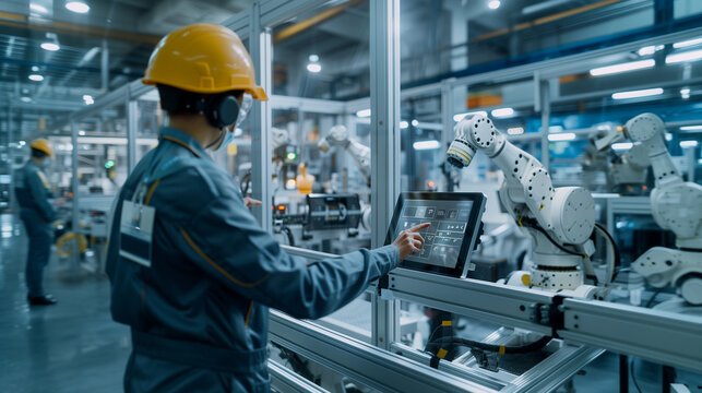 Engineer in factory analyzing futuristic digital interface
