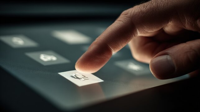 Person's finger pressing a touchscreen interface with glowing icons, showcasing modern technology interaction and digital control