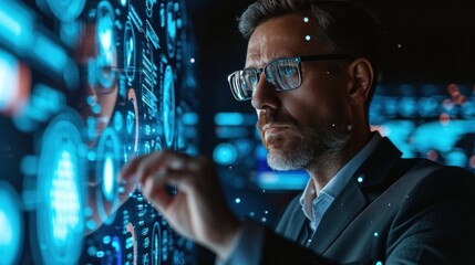 Business professional interacting with futuristic digital data interface using touch gestures in a dark environment showcasing advanced technology and analytics