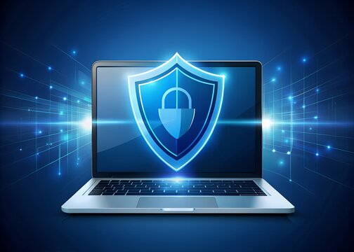 Laptop displaying a glowing blue shield with a padlock icon, symbolizing digital security and data protection